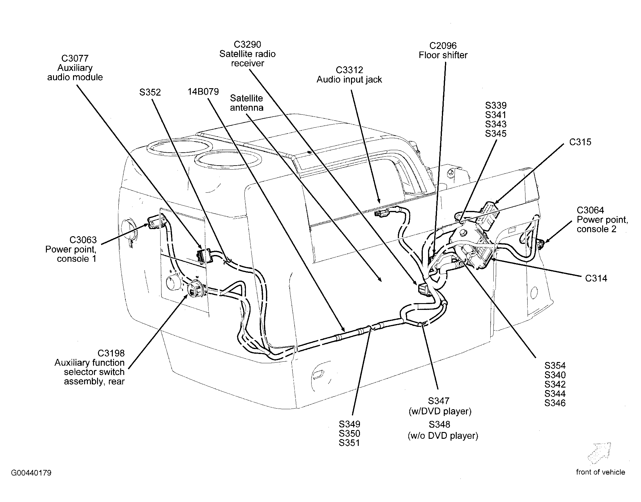 | Auxiliary Audio Module | Rear of center console. See Figure. |