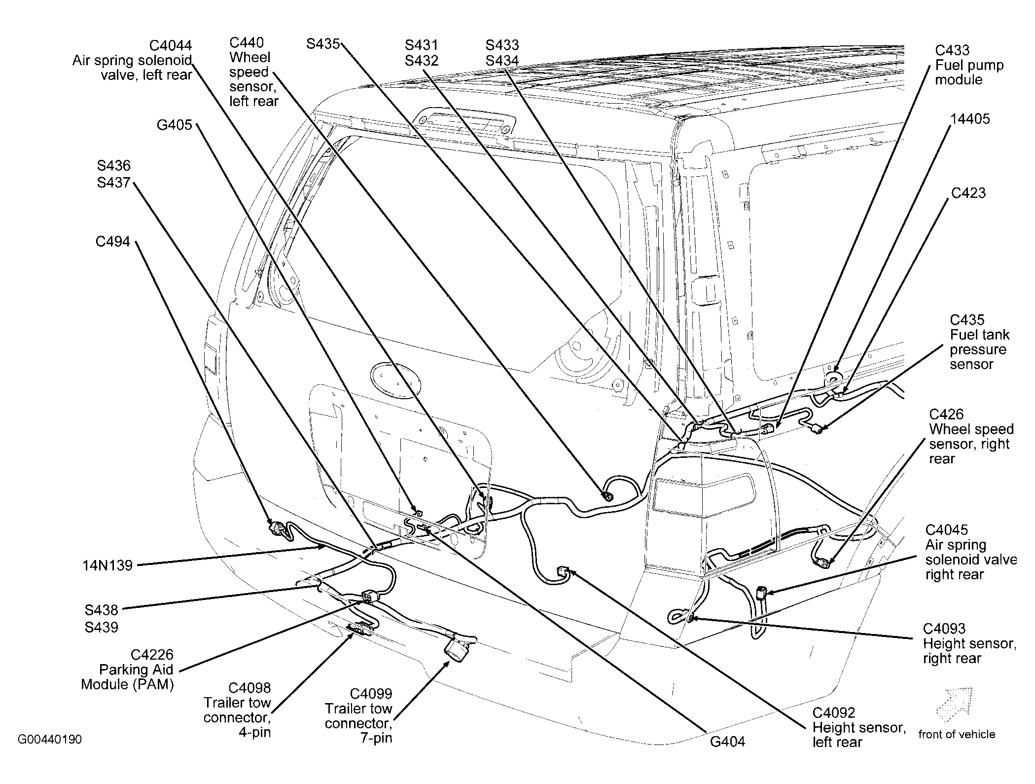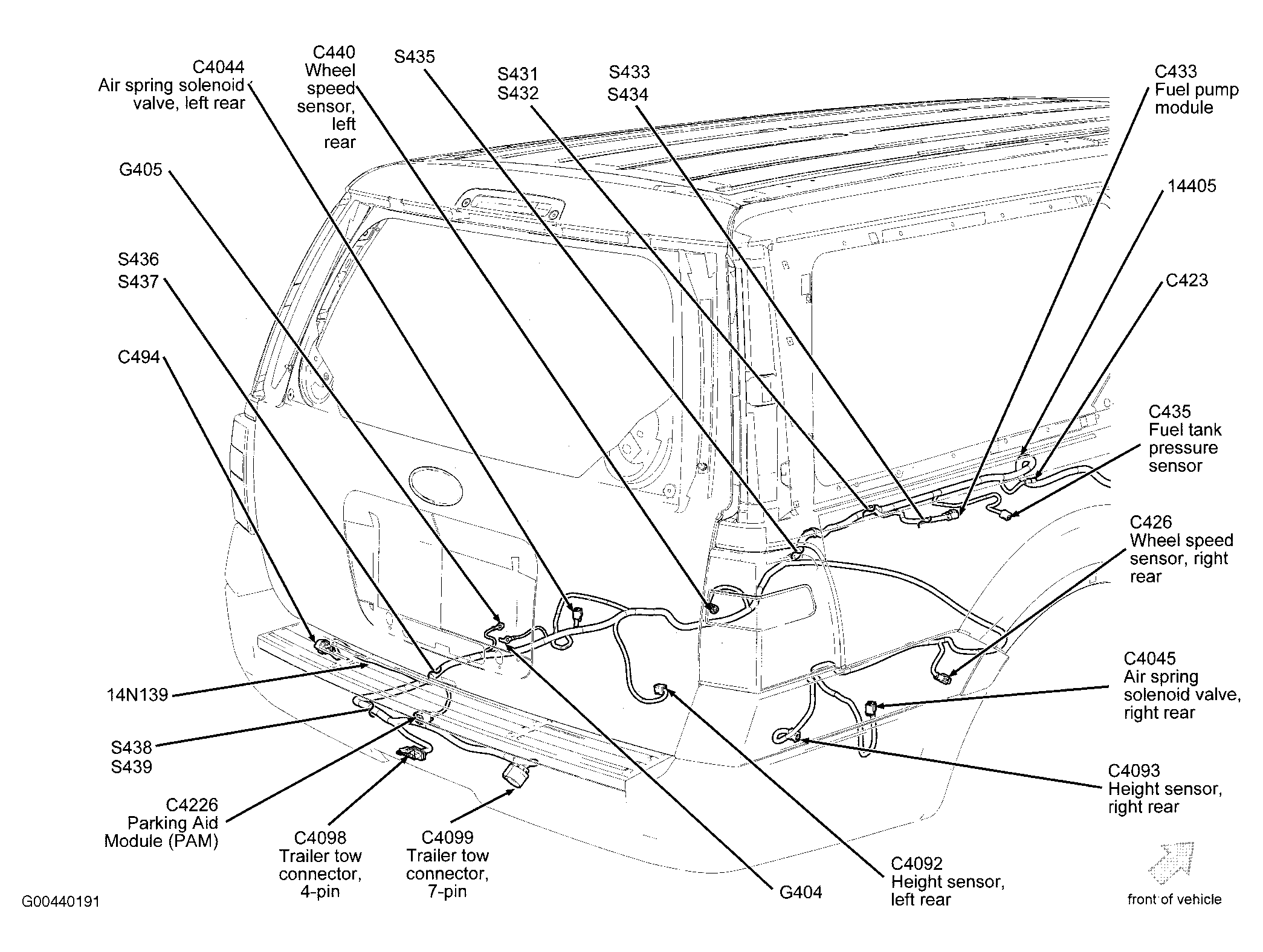 | Parking Aid Module (PAM) (Expedition-EL & Navigator-L) | Under center rear of vehicle. See Figure. |