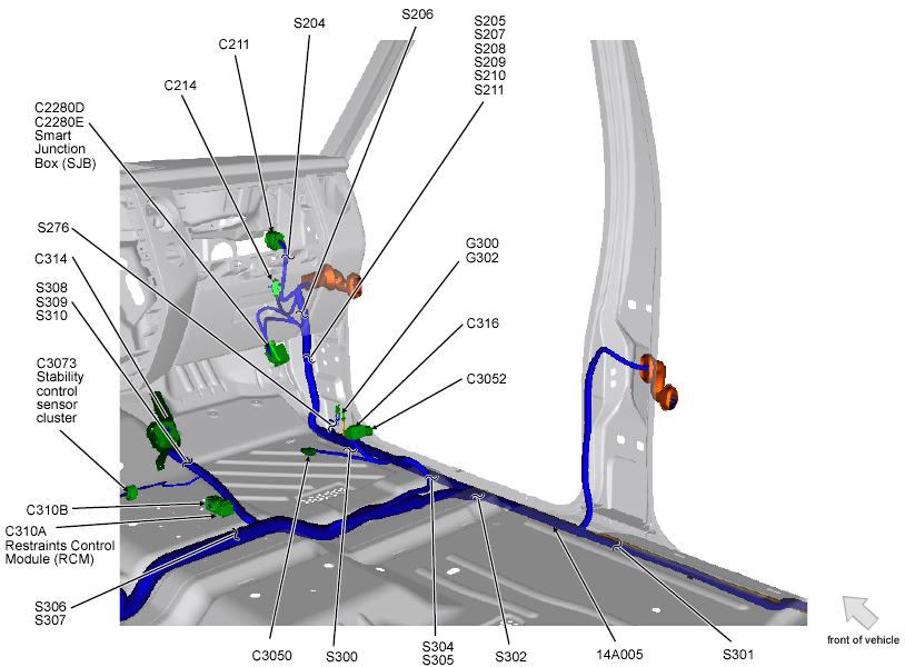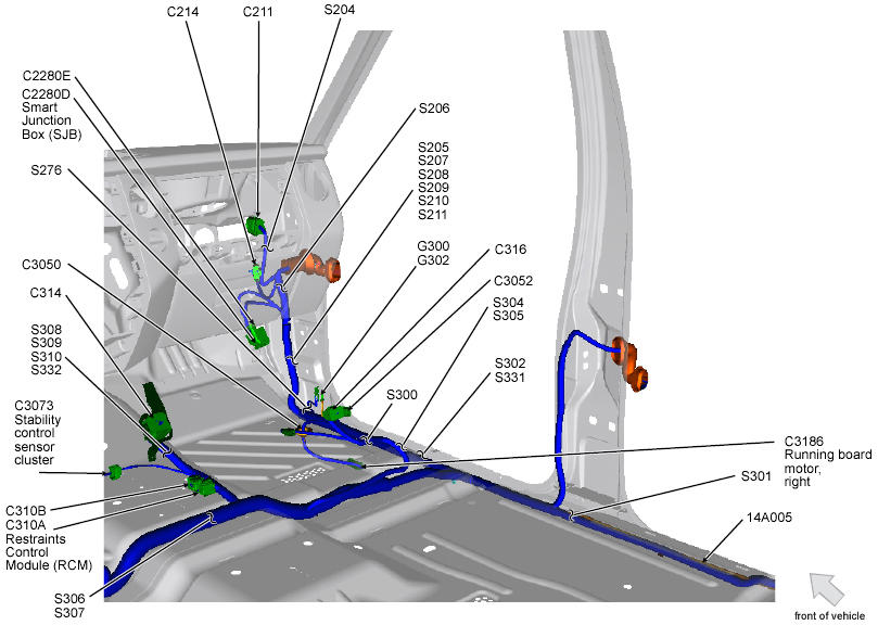 | Restraints Control Module (RCM) (Navigator) | Below center console. See Figure. |