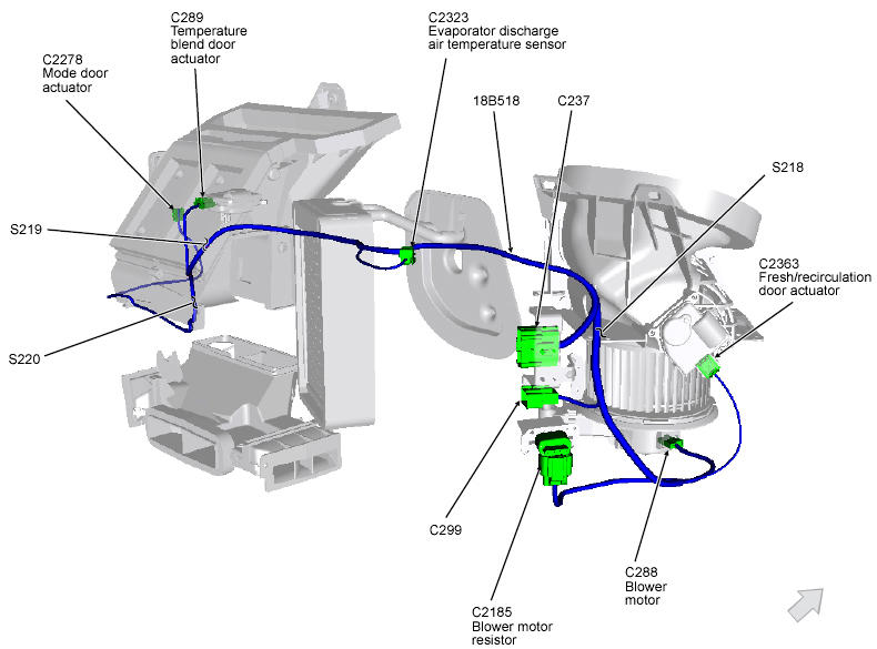 | Heater Blower Control Module | Right side of HVAC unit. See Figure. |