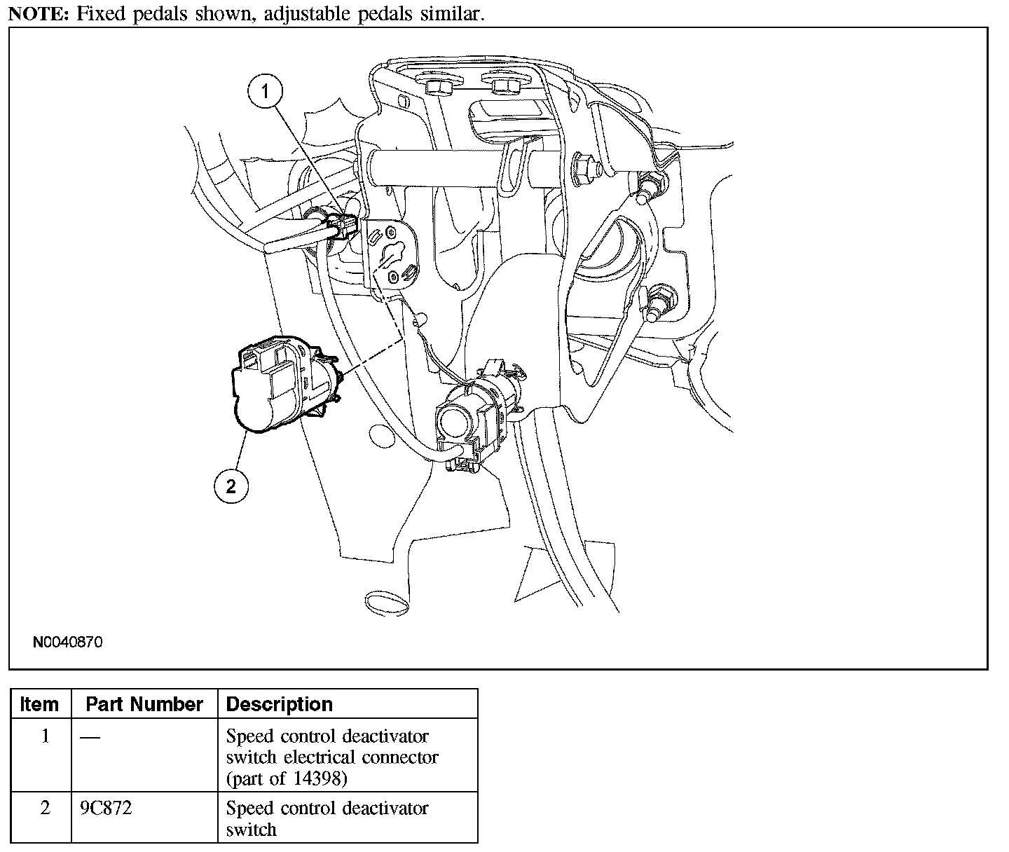 CAUTION: Do not remove or repair the brake pedal, brake booster or master cylinder without first removing the speed control deactivator switch. Do not install the speed control deactivator switch without the brake pedal arm secured to the brake booster push rod. Do not pull or push on the brake pedal when removing or installing the speed control deactivator switch, as misadjustment or damage to the switch may occur.