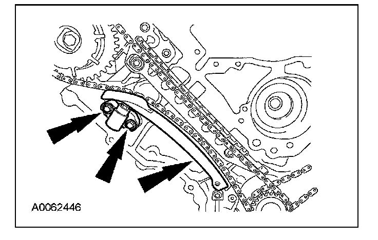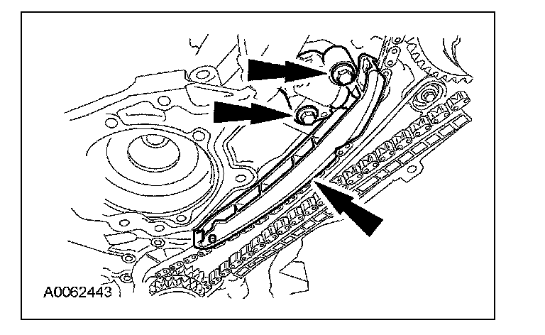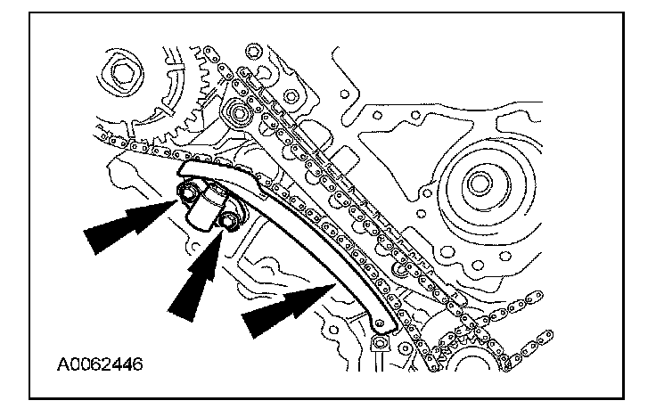10. Remove the bolts, the LH timing chain tensioner and tensioner arm.