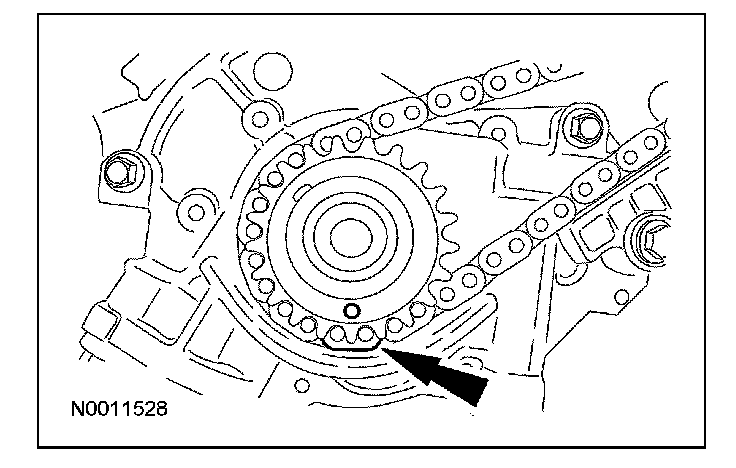 NOTE: The lower half of the timing chain must be positioned above the tensioner arm dowel.