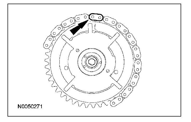 Position the LH timing chain on the camshaft sprocket. Make sure the camshaft sprocket timing mark is aligned with the colored (marked) chain link.