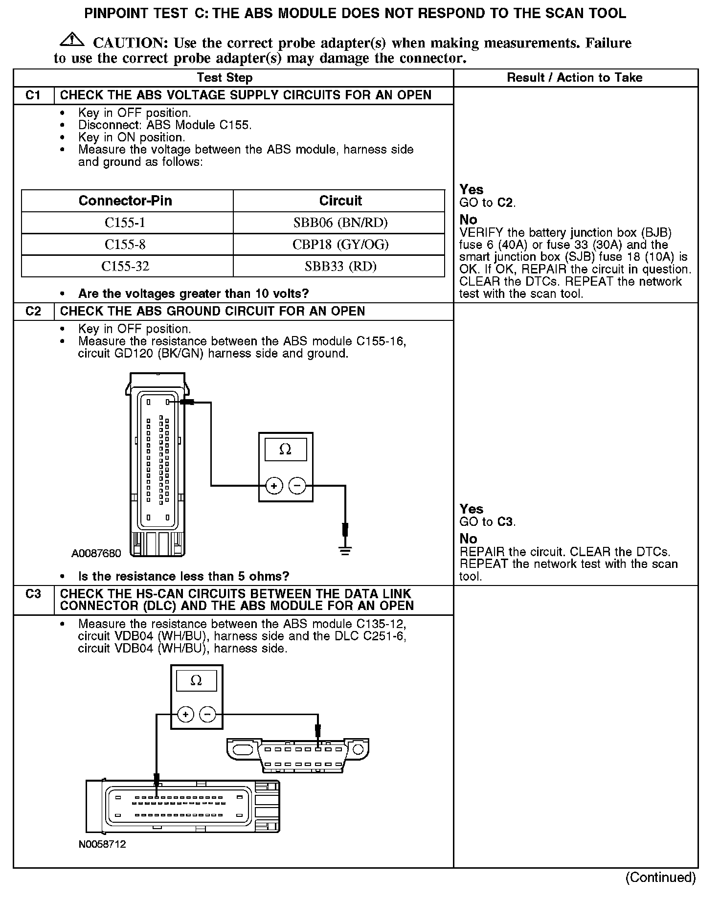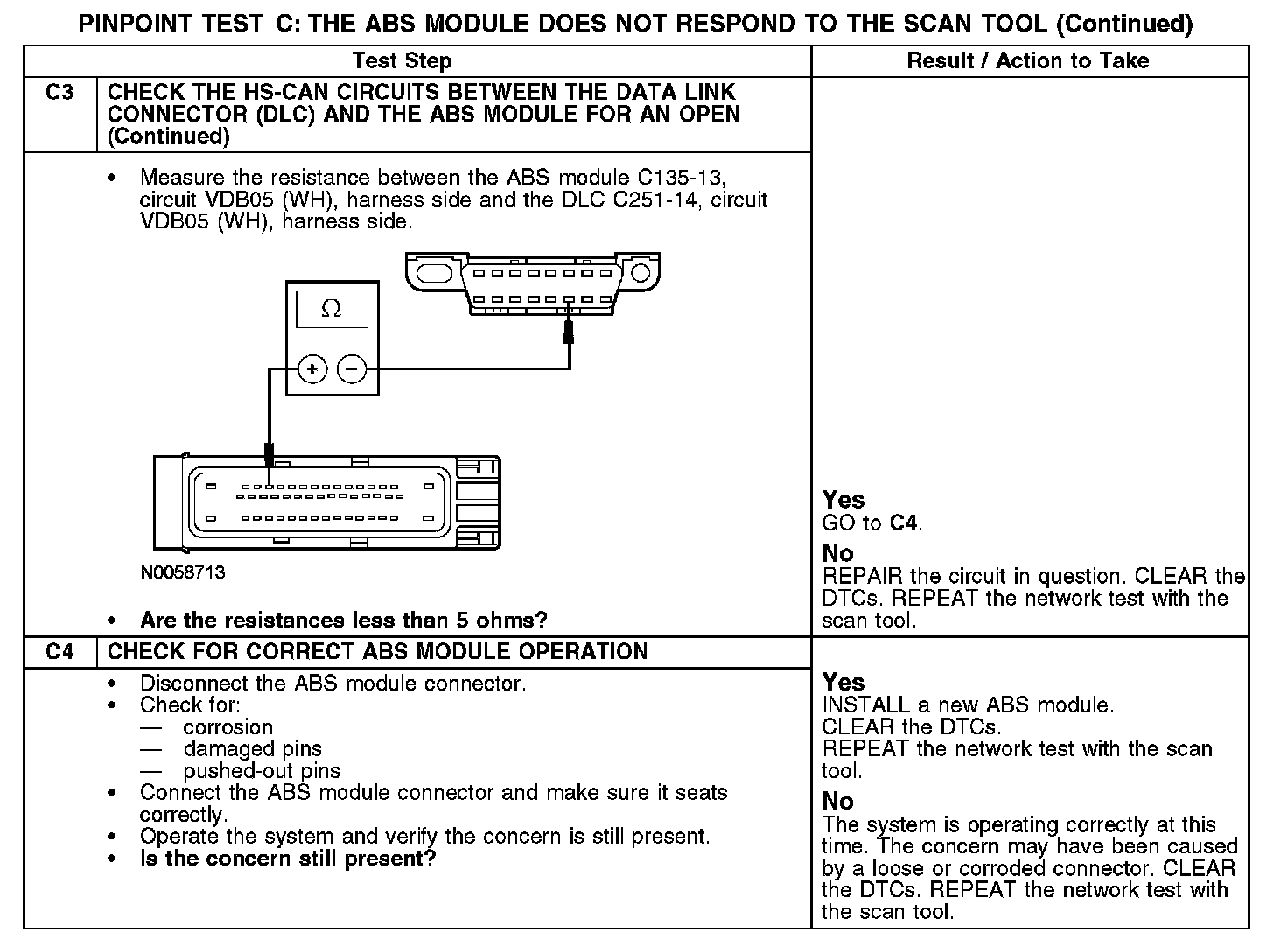 Home >> Ford >> 2008 >> Explorer 2WD V8-4.6L >> Repair and Diagnosis >> Powertrain Management >> Computers and Control Systems >> Information Bus >> Testing and Inspection >> Pinpoint Tests >> Test C: The ABS Module Does Not Respond To The Scan Tool