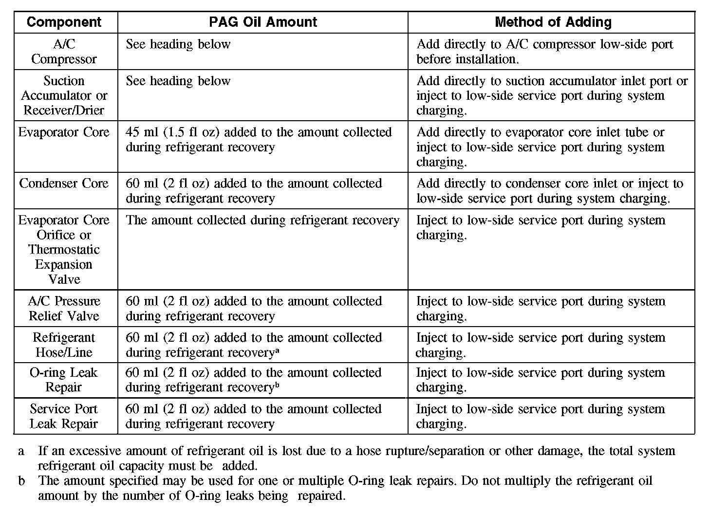 NOTE: During normal A/C operation, oil is circulated through the system with the refrigerant, and a small amount is retained in each component. If certain components of the system are removed, some of the refrigerant oil will go with the component. To maintain the original total oil charge, it is necessary to compensate for the oil lost by adding oil to the system with the new part.