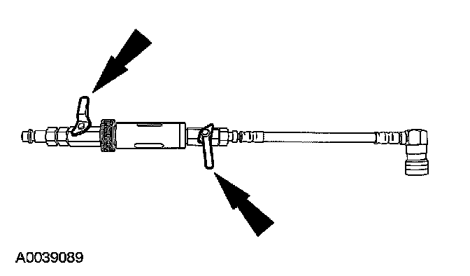 5. Install the dye/lubricant injector between the low-side service gauge port valve and the refrigerant service station or manifold gauge set.