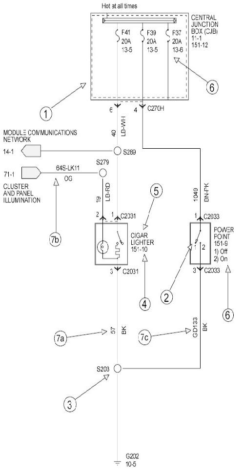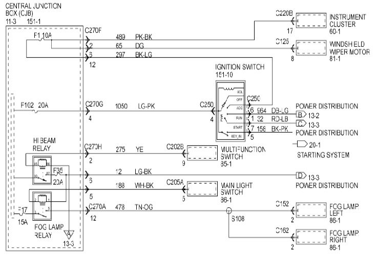 Ford Motor Company uses three different circuit numbering conventions: Standard Circuit Numbering System, Global Circuit Numbering System, and New Global Circuit Numbering System (NGCNS). With each, the circuit number (which identifies a specific circuit function) is followed by the wire color.