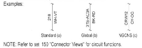 Connector Views show the views of the pins and/or cavities of all connectors. The pin and cavity sides are shown separately as if the connector were disconnected. The color of the connector housing is indicated next to the connector number when available. The harness causal number is located above the connector view and below the connector number. The circuit function charts are located below each connector. The wiring harness designations are listed in Component Location Charts.