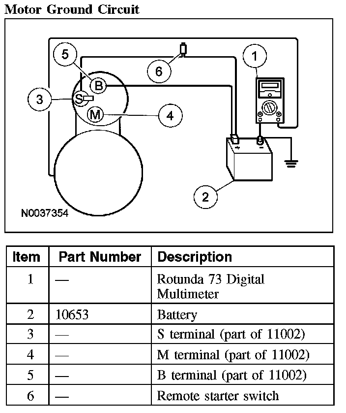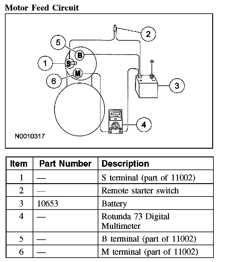 8. Remove the cables from solenoid B, S and M terminals. Clean the cables and connections and reinstall the cables to the correct terminals. Repeat Steps 3 through 6. If the voltage drop reading is still greater than 0.5 volt when checked at the M terminal and less than 0.5 volt when checked at the B terminal, the concern is in the solenoid contacts. Install a new starter motor.