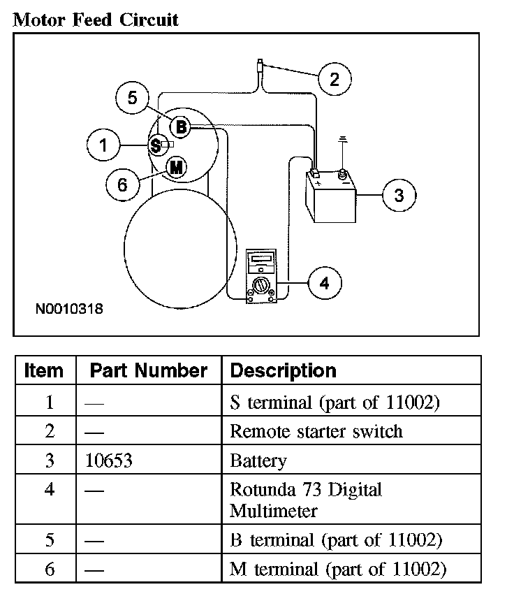 7. If the voltage reading is greater than 0.5 volt, indicating excessive resistance, move the Rotunda 73 Digital Multimeter negative lead to the starter solenoid B terminal and repeat the test. If the voltage reading at the B terminal is lower than 0.5 volt, the concern is either in the connections at the starter solenoid or in the solenoid contacts.