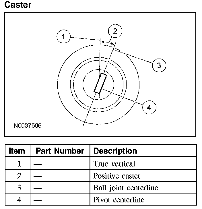 Caster is the deviation from vertical of an imaginary line drawn through the ball joints when viewed from the side. The caster specifications in this section will give the vehicle the best directional stability characteristics when loaded and driven.