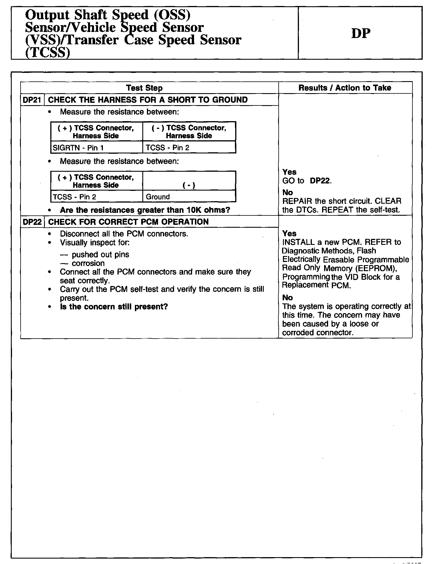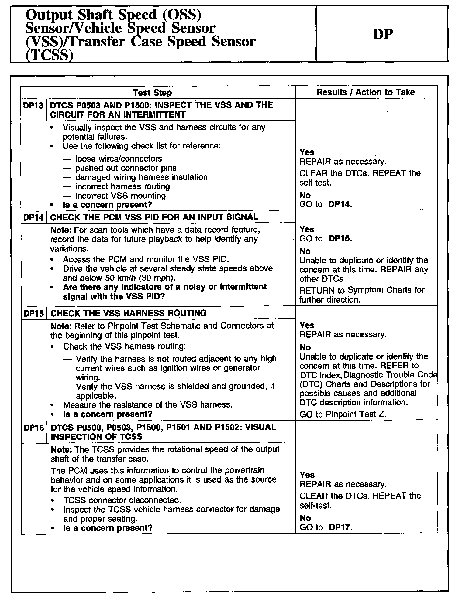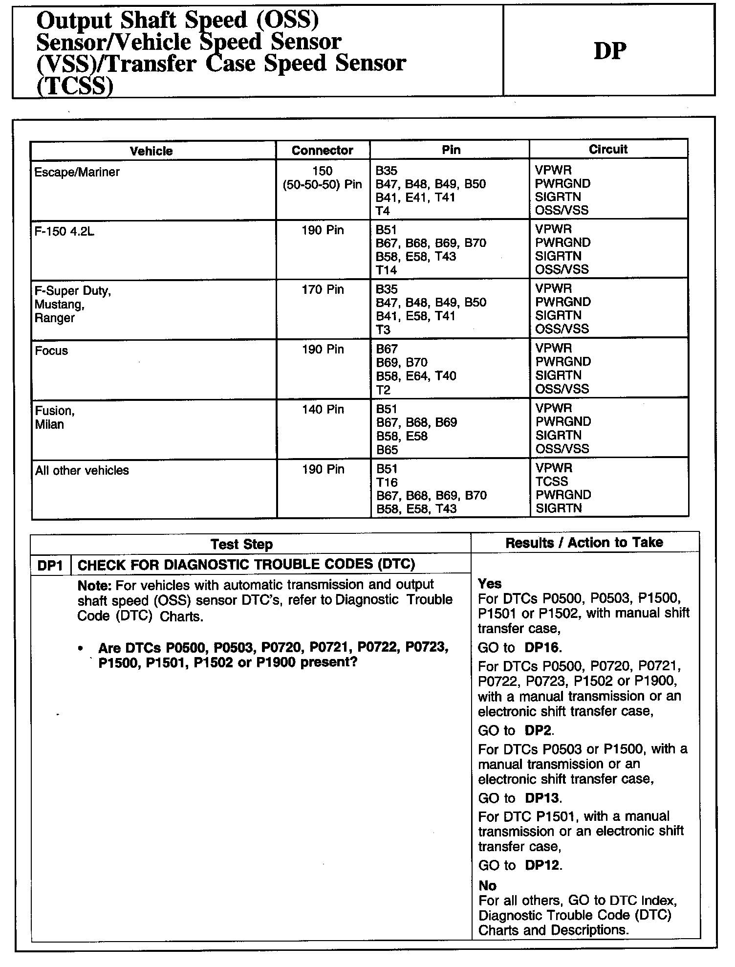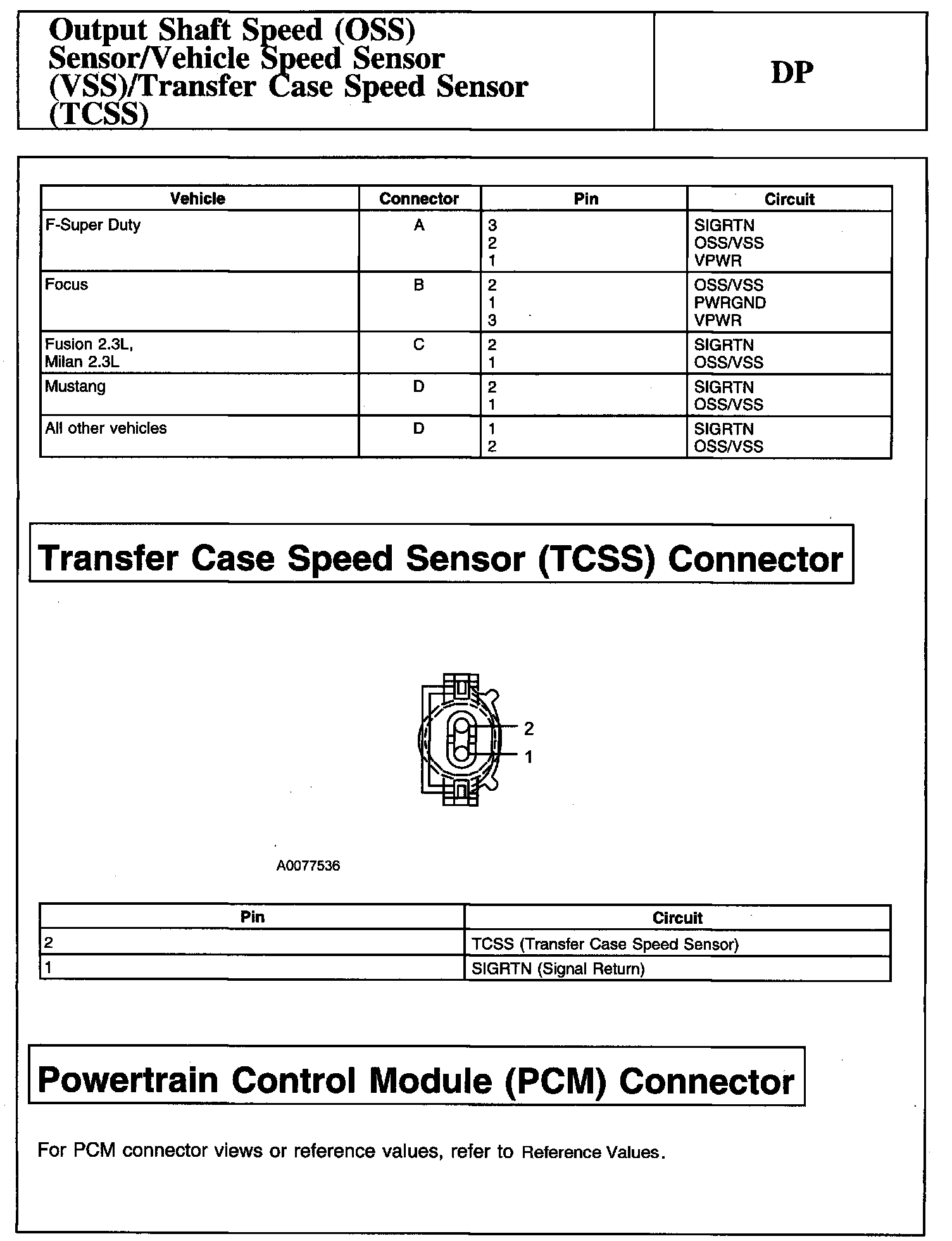 Home >> Ford >> 2008 >> F 150 4WD V8-5.4L Flex Fuel >> Repair and Diagnosis >> Powertrain Management >> Computers and Control Systems >> Testing and Inspection >> Pinpoint Tests >> Tests DP: Output Shaft Speed (OSS) Sensor/Vehicle Speed Sensor (VSS)/Transfer Case Speed Sensor (TCSS)