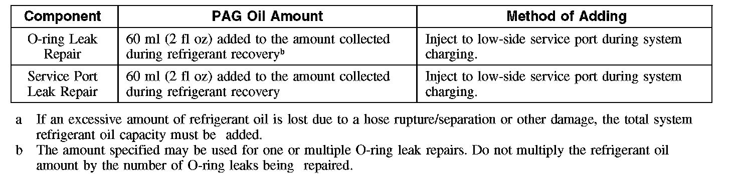NOTE: During normal A/C operation, oil is circulated through the system with the refrigerant, and a small amount is retained in each component. If certain components of the system are removed, some of the refrigerant oil will go with the component. To maintain the original total oil charge, it is necessary to compensate for the oil lost by adding oil to the system with the new part.