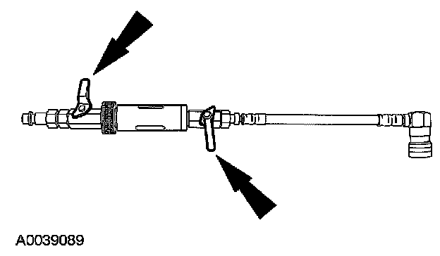 5. Install the dye/lubricant injector between the low-side service gauge port valve and the refrigerant service station or manifold gauge set.