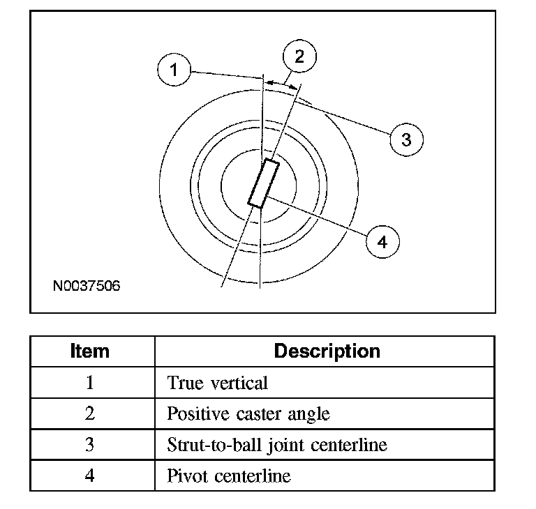 Caster is the deviation from vertical of an imaginary line drawn through the pivot points (top of strut and lower ball joint), when viewed from the side. The caster specifications will give the vehicle the best directional stability characteristics when loaded and driven. The caster setting is not related to tire wear. The caster setting is not adjustable.