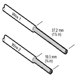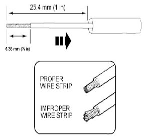 2. Strip 6.35mm (1/4 in) of insulation from each wire end, taking care not to nick or cut wire strands.