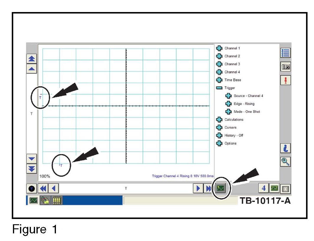 If using Oscilloscope function on IDS, the T icon at the bottom right of the screen adjusts the vertical trigger level by using the arrow keys. Do not be concerned that the precise trigger position readout on IDS is expressed in voltage. This is because the current probe's raw signal is a voltage proportional to current.