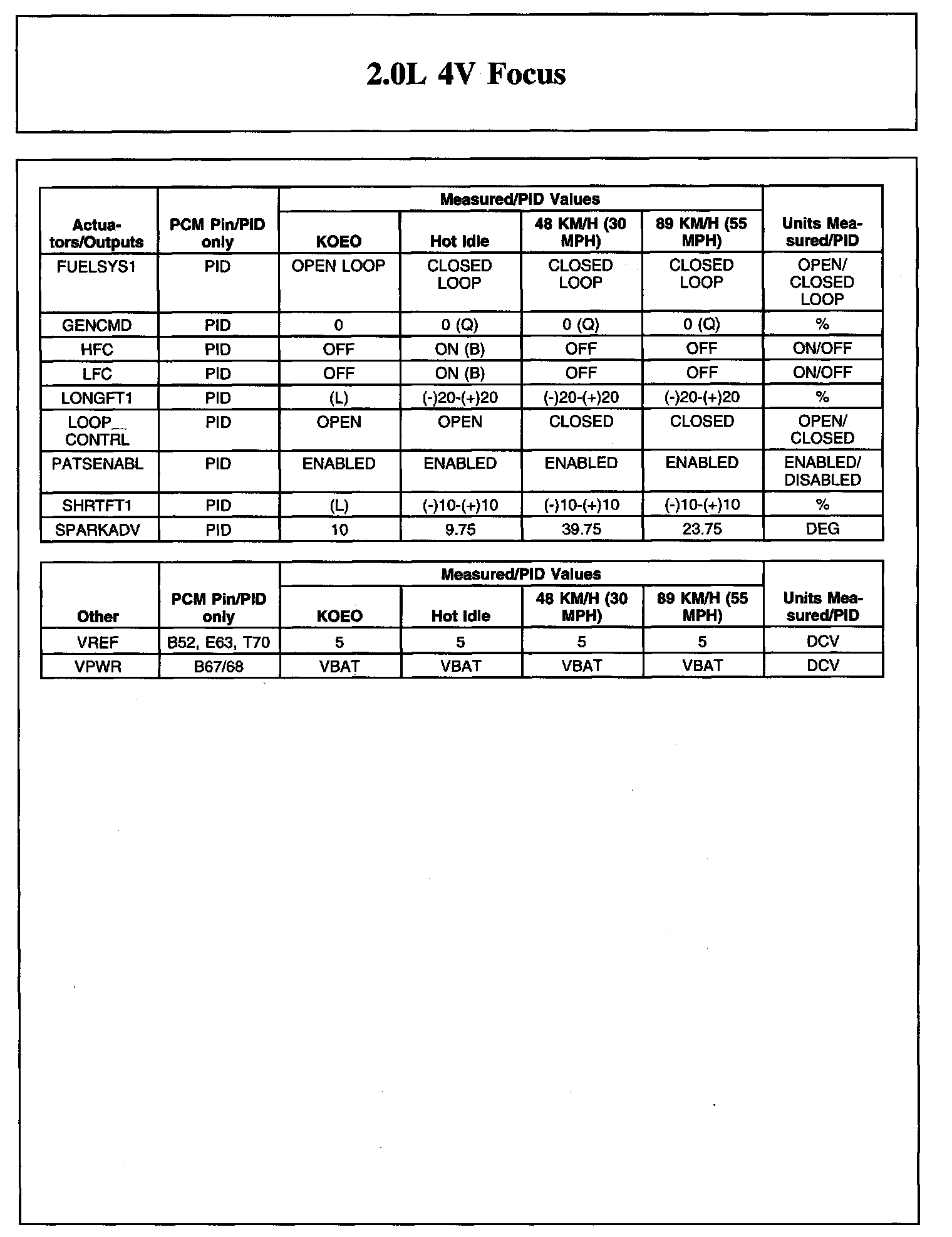 The Typical Diagnostic Reference Value Charts do not display fault parameter identifications (PIDs). These are PIDs which indicate a hard fault with the circuit. They display a value of YES or NO and are PIDs ending with the letter F.