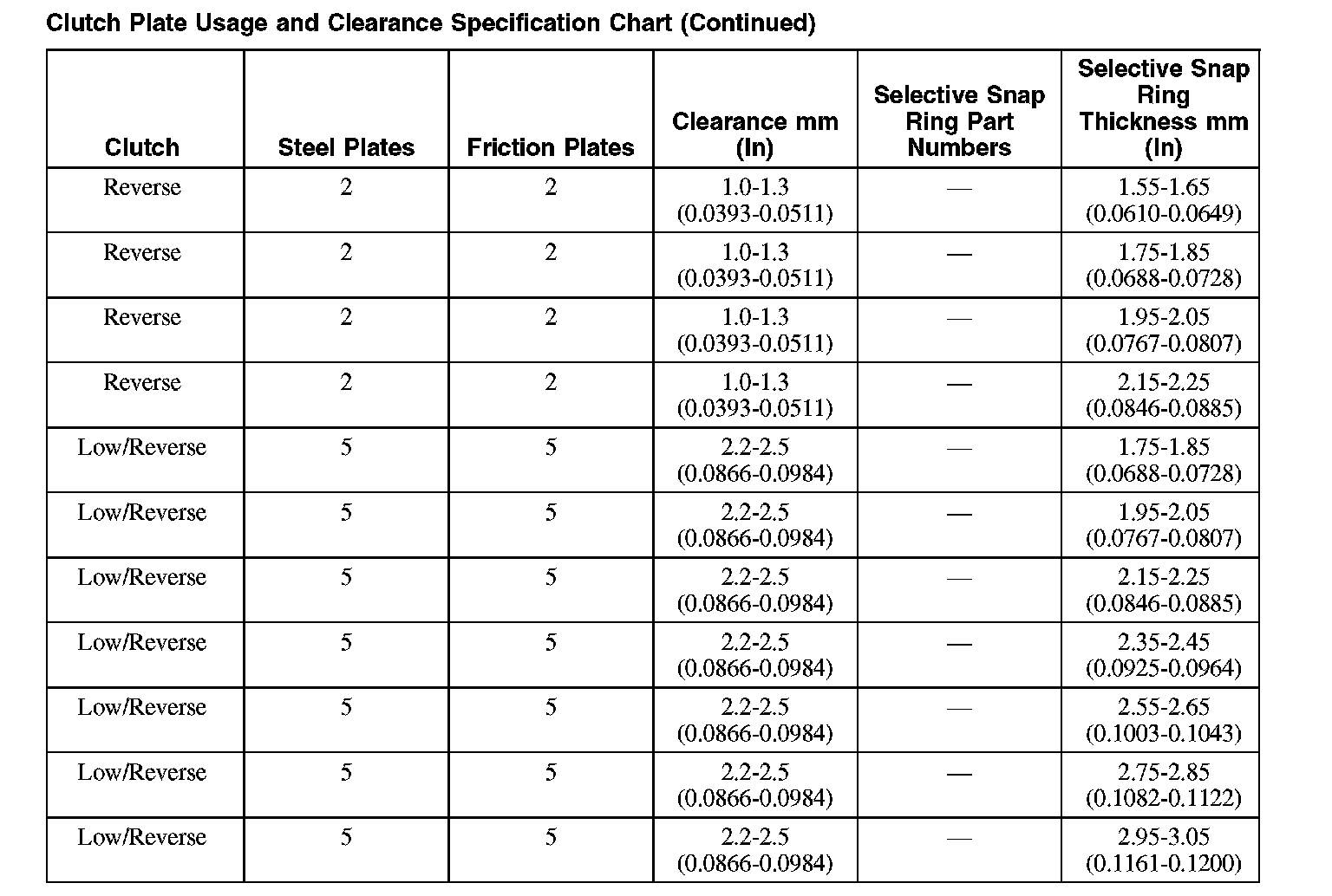 Clutch Plate Usage and Clearance Specification Chart (Part 2):