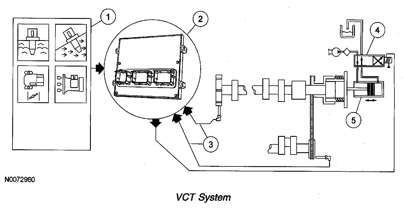 1. The PCM receives input signals from the intake air temperature (IAT) sensor, engine coolant temperature (ECT) sensor, engine oil temperature (EOT) sensor, CMP, throttle position (TP) sensor, mass air flow (MAF) sensor, and CKP to determine the operating conditions of the engine. At idle and low engine speeds with closed throttle, the PCM controls the camshaft position based on ECT, EOT, IAT, and MAF. During part and wide open throttle, the camshaft position is determined by engine RPM, load and throttle position. The VCT system does not operate until the engine is at normal operating temperature.