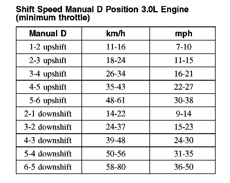 Shift Speed Manual D Position 3.0L Engine (minimum throttle):