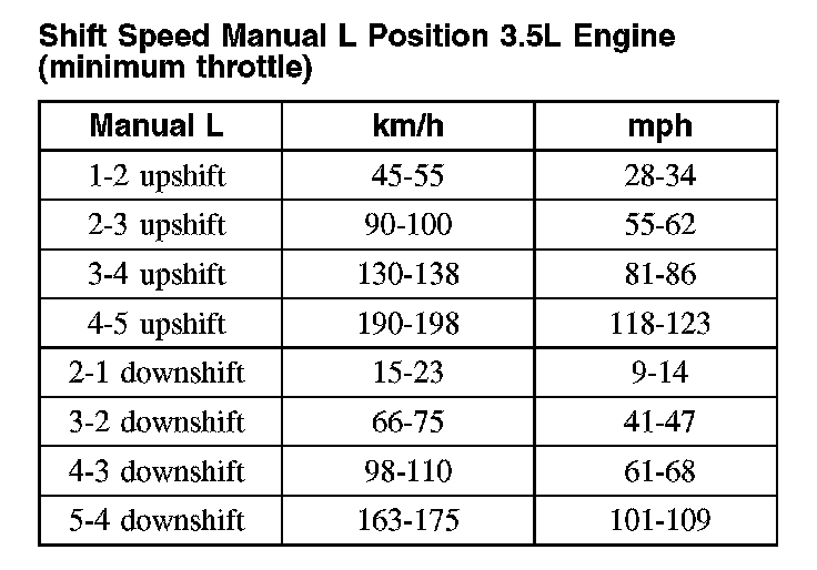 Shift Speed Manual L Position 3.5L Engine (minimum throttle)