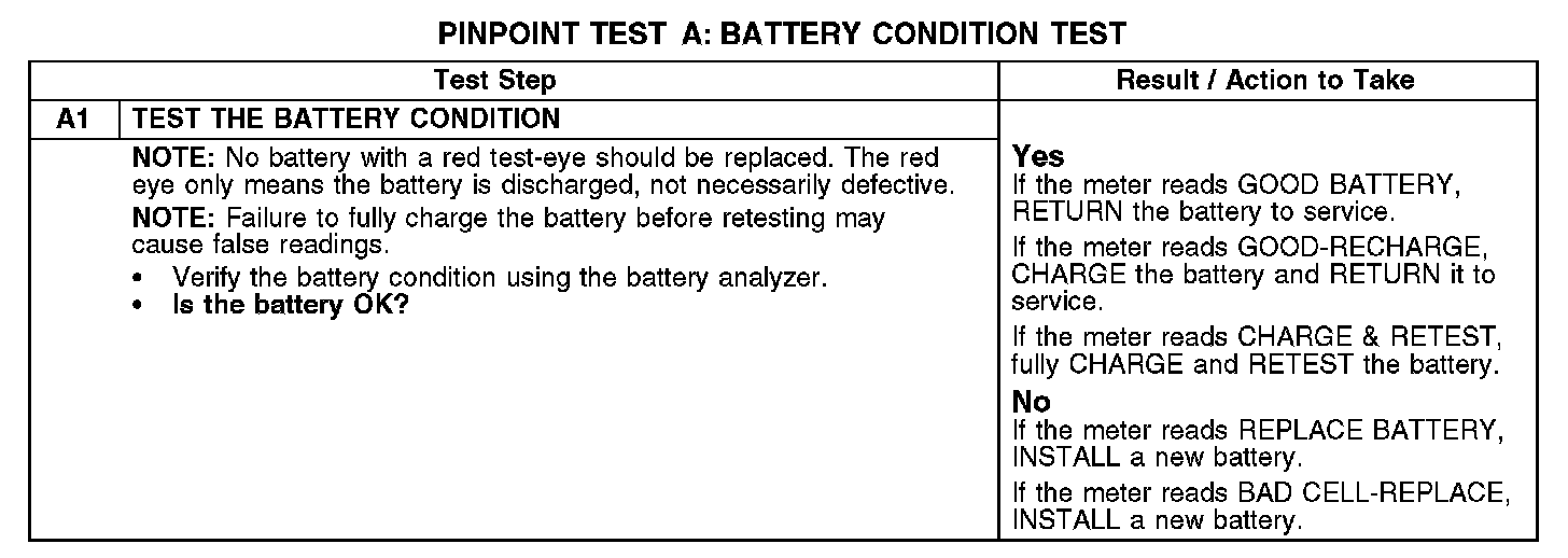 PINPOINT TEST A: BATTERY CONDITION TEST
