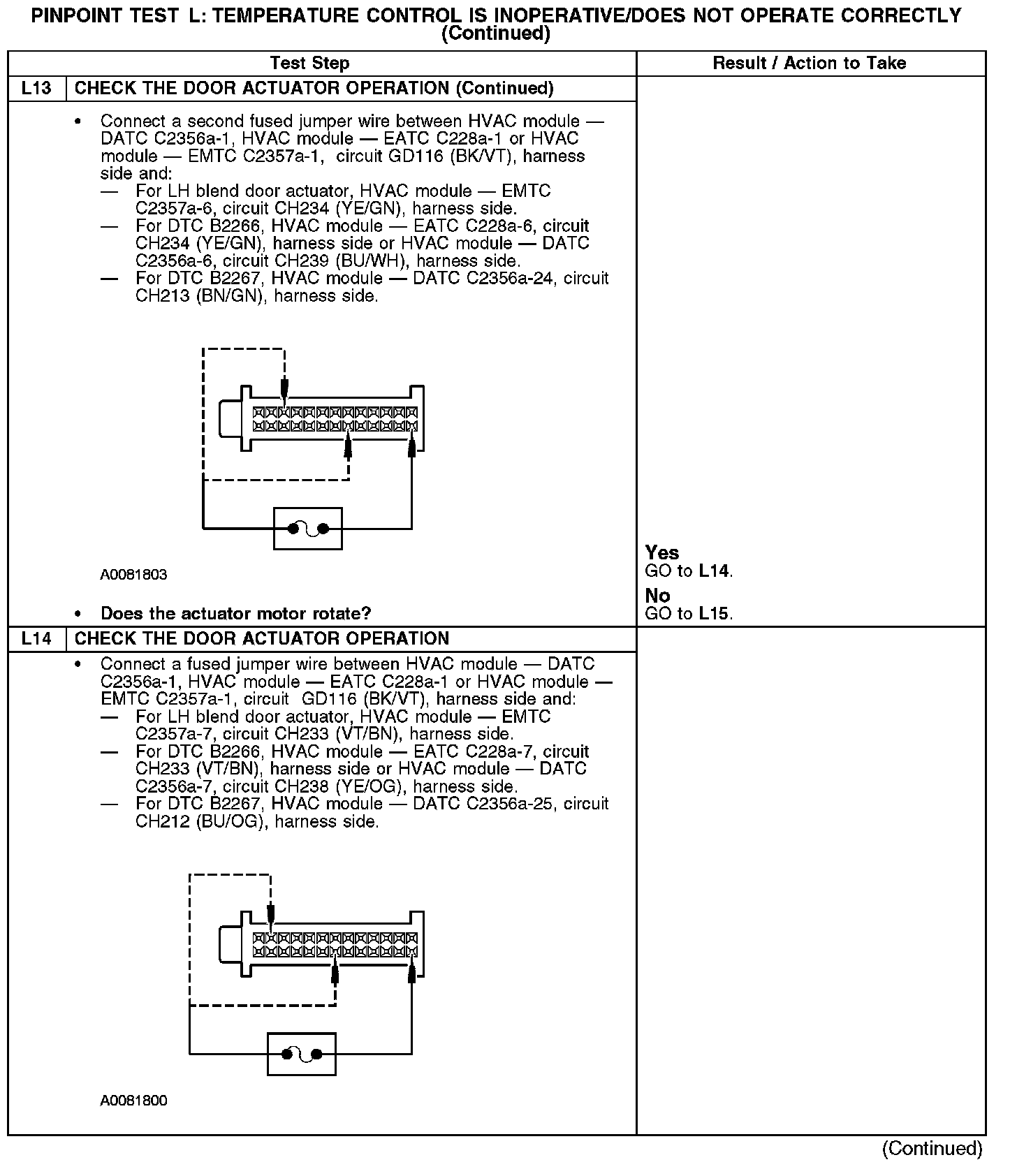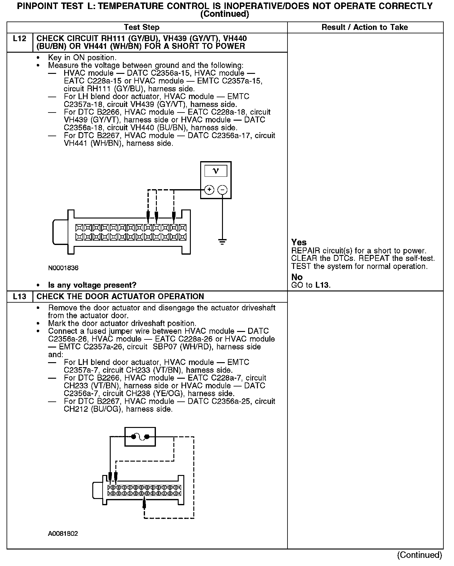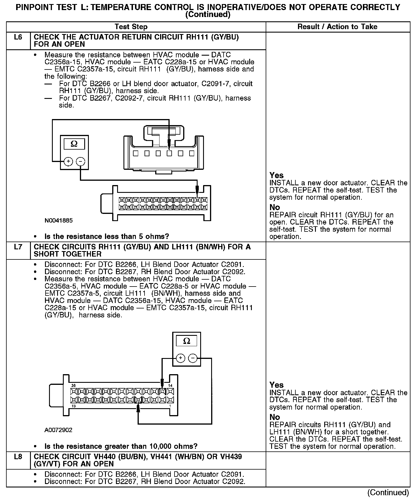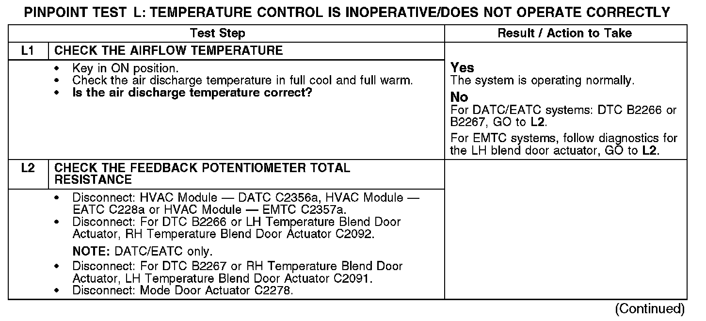 Home >> Ford >> 2008 >> Fusion FWD L4-2.3L >> Repair and Diagnosis >> Heating and Air Conditioning >> Testing and Inspection >> Pinpoint Tests >> Test L: Temperature Control Is Inoperative/Does Not Operate Correctly