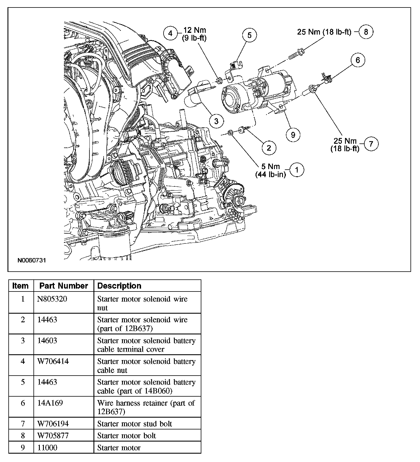 8. Remove the starter motor bolt, stud bolt and the starter motor.