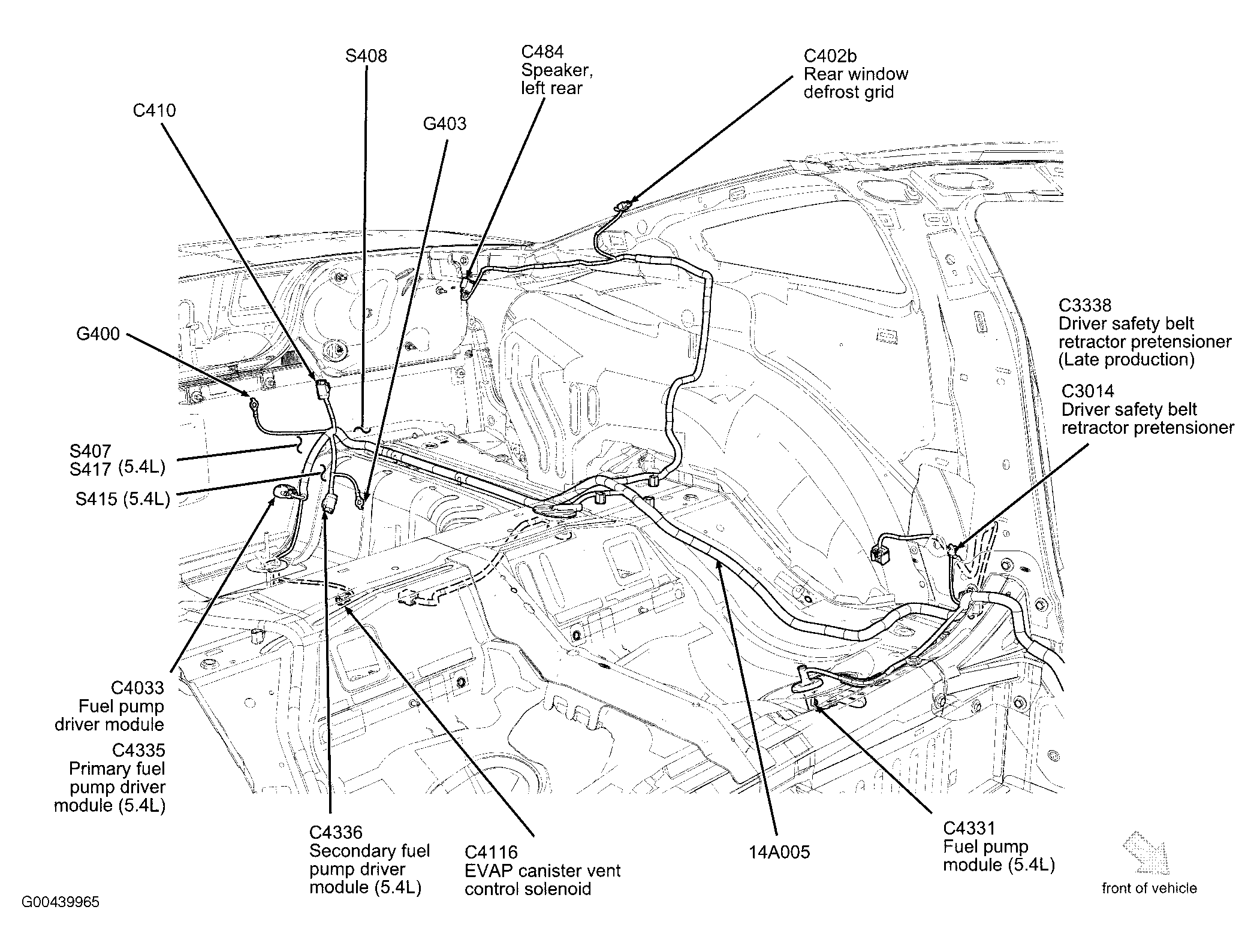 | Primary Fuel Pump Driver Module (5.4L) | Top left rear of fuel tank. See Figure. |
