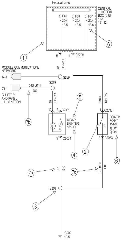 Ford Motor Company uses three different circuit numbering conventions: Standard Circuit Numbering System, Global Circuit Numbering System, and Next Global Circuit Numbering System (NGCNS). With each, the circuit number (which identifies a specific circuit function) is followed by the wire color.