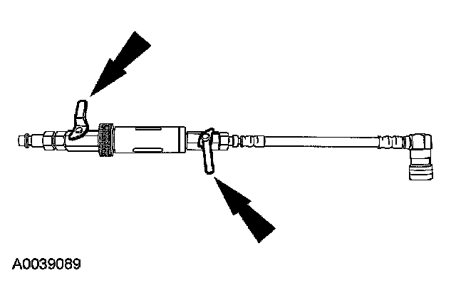5. Install the dye/lubricant injector between the low-side service gauge port valve and the refrigerant service station or manifold gauge set.