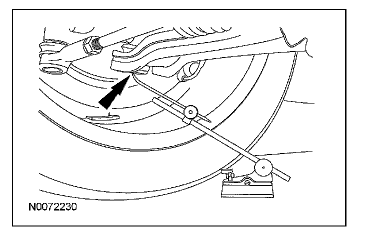 1. Position a suitable surface gauge (such as Starrett 57D Surface Gauge), on a flat, level surface and adjust the gauge's arm until the scriber point is located in the center of the lower control arm forward bolt.