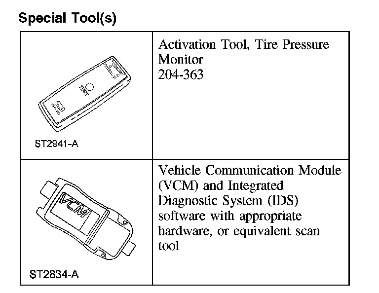 NOTE: If the vehicle has been stationary for more than 30 minutes, the sensors will go into a "sleep mode" to conserve battery power. It will be necessary to wake them up so they will transmit the latest tire pressure information to the smart junction box (SJB). For additional information, refer to Tire Pressure Monitoring System (TPMS) Sensor Activation. Tire Pressure Monitoring System (TPMS) Sensor Activation