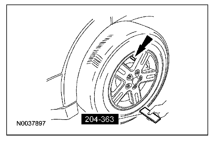 Place the activation tool on the LF tire sidewall opposite (180 degrees) from the valve stem. Press and release the test button on the special tool. The horn will sound briefly to indicate that the tire pressure sensor has been recognized by the SJB.