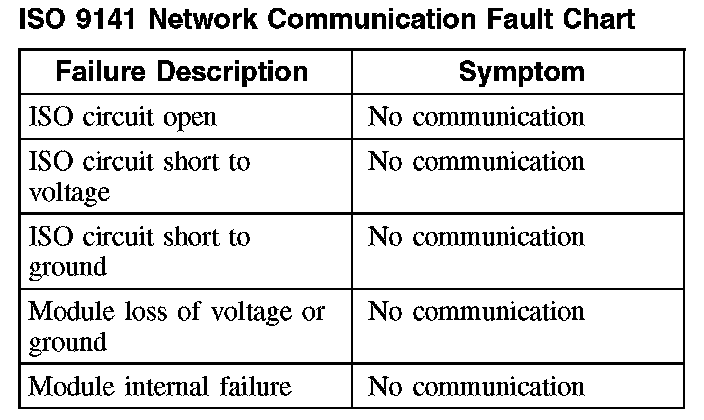The following fault chart describes the specific ISO 9141 network failures and their resulting symptom: