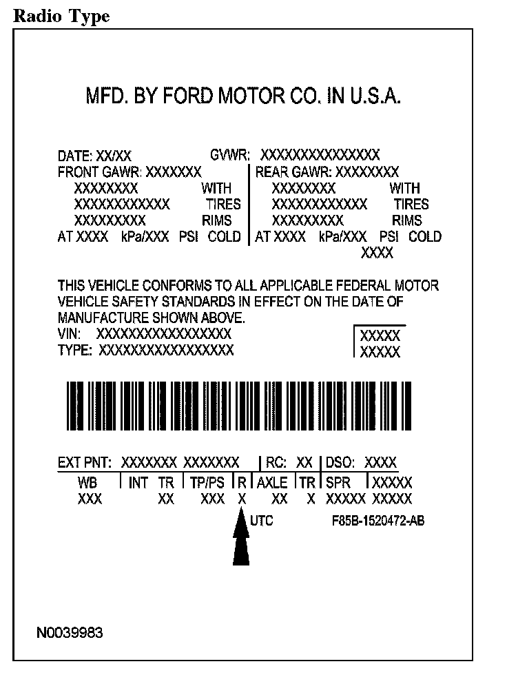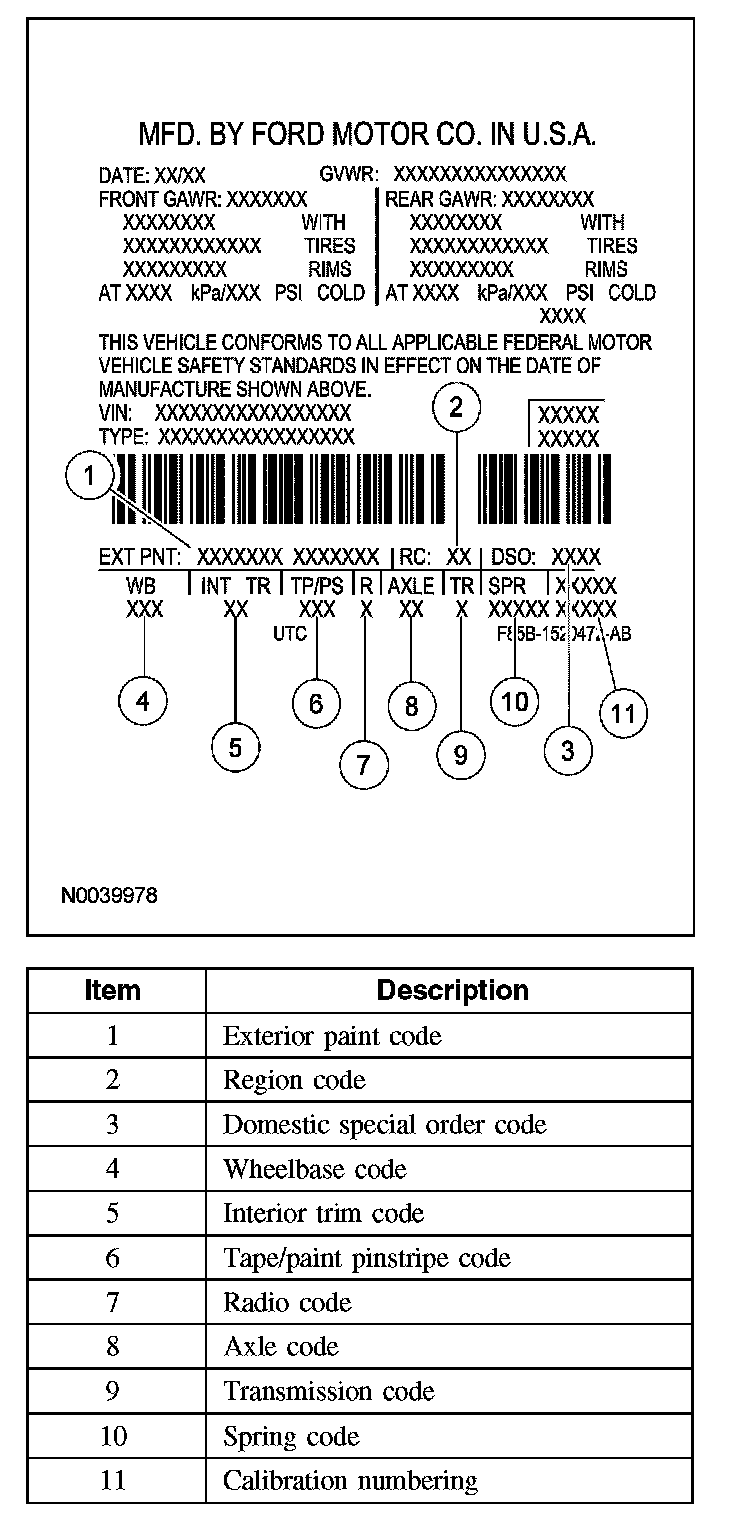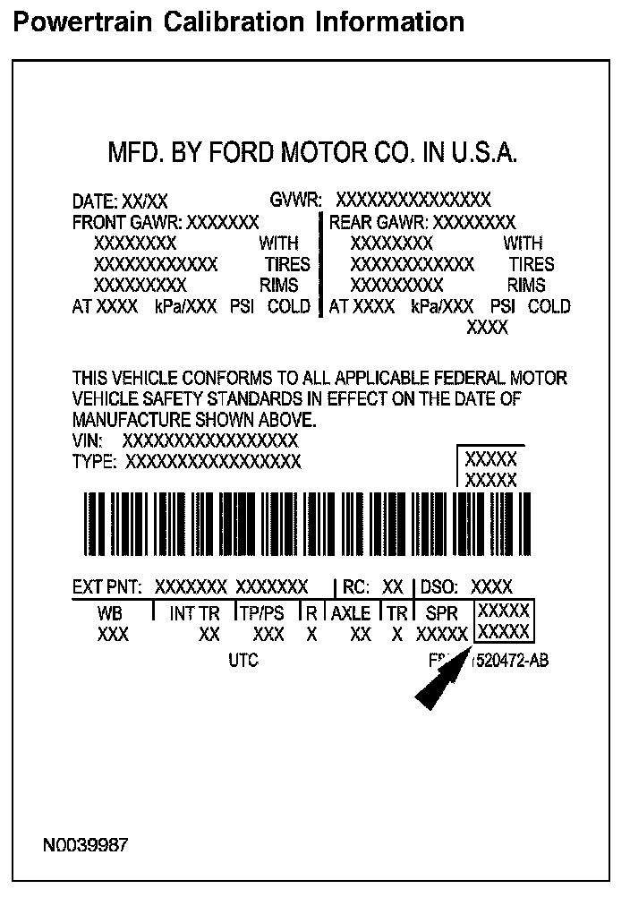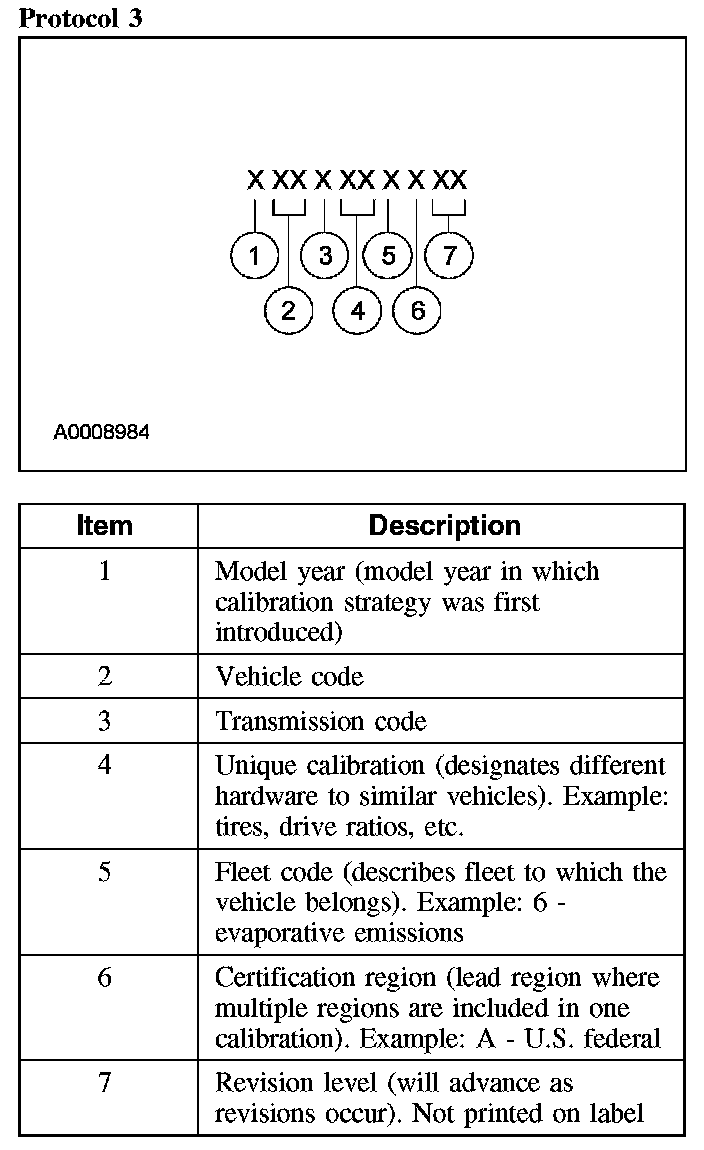 Powertrain calibration information is printed in the lower right corner of the vehicle certification label. Only the base calibration information is printed. Revision levels will not appear, however, this information can be found in On Line Automotive Service Information System (OASIS). For the current model year, Ford Motor Company is using 3 different protocols which describe powertrain base calibration. These protocols are designed to provide worldwide standardization for vehicle calibration. If the electronic calibration strategy has been used since 1998 and carried into the current model year, Protocol 1 will be used. Refer to Protocol 1 below. If the electronic calibration strategy has been used since 1999 and is carried into the current model year, Protocol 2 will be used. Refer to Protocol 2 below. Electronic calibration strategies introduced in the 2000 or later model years will use Protocol 3. Refer to Protocol 3 below.