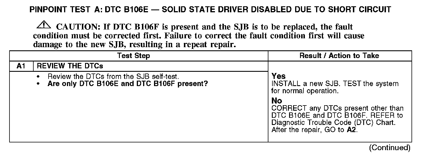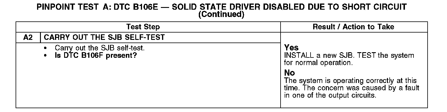 PINPOINT TEST A: DTC B106E - SOLID STATE DRIVER DISABLED DUE TO SHORT CIRCUITNormal Operation