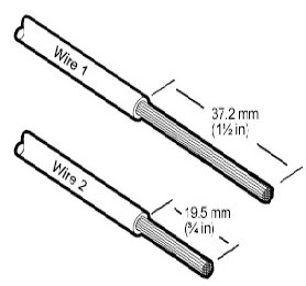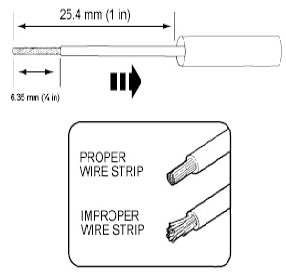 2. Strip 6.35mm (1/4 in) of insulation from each wire end, taking care not to nick or cut wire strands.