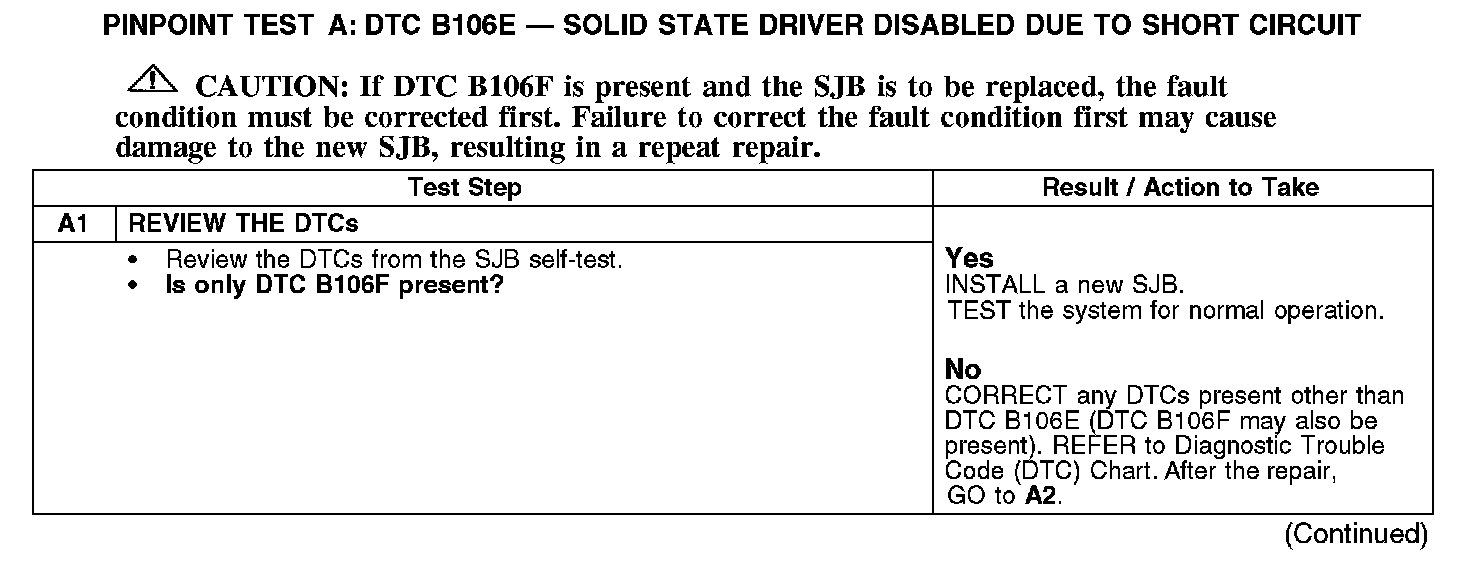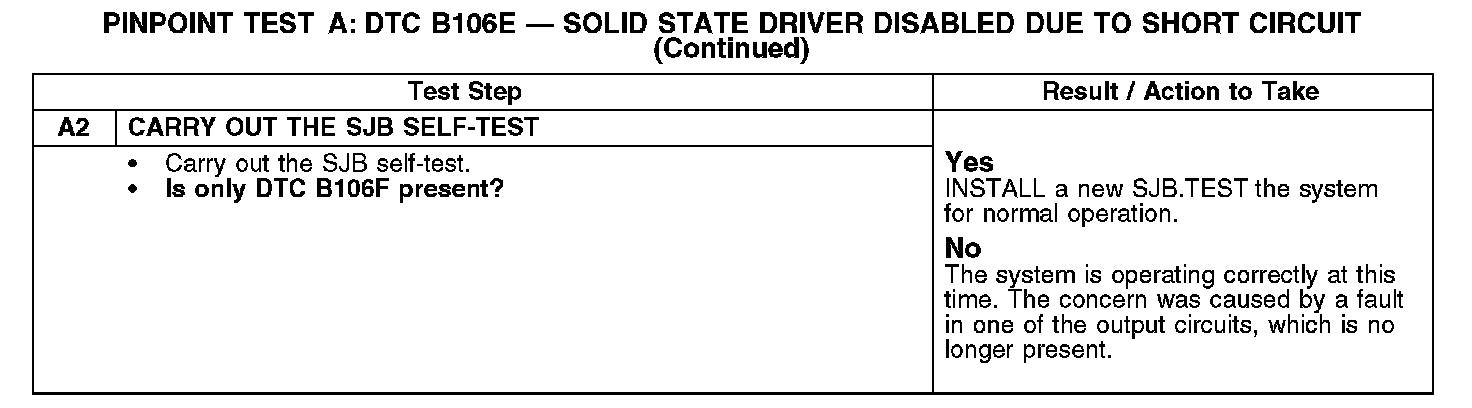 PINPOINT TEST A: DTC B106E - SOLID STATE DRIVER DISABLED DUE TO SHORT CIRCUIT