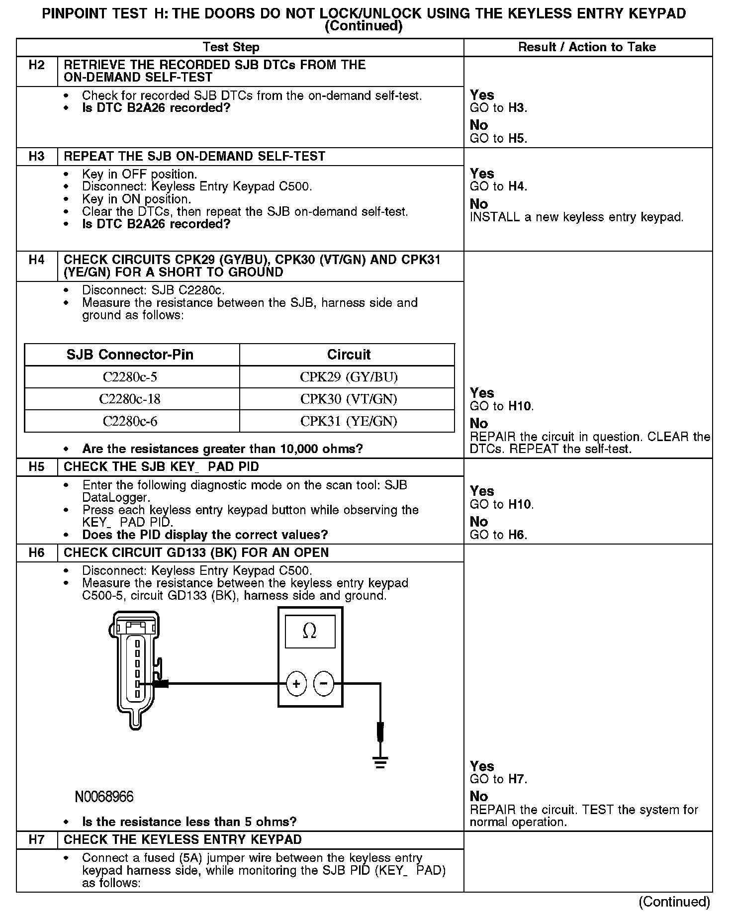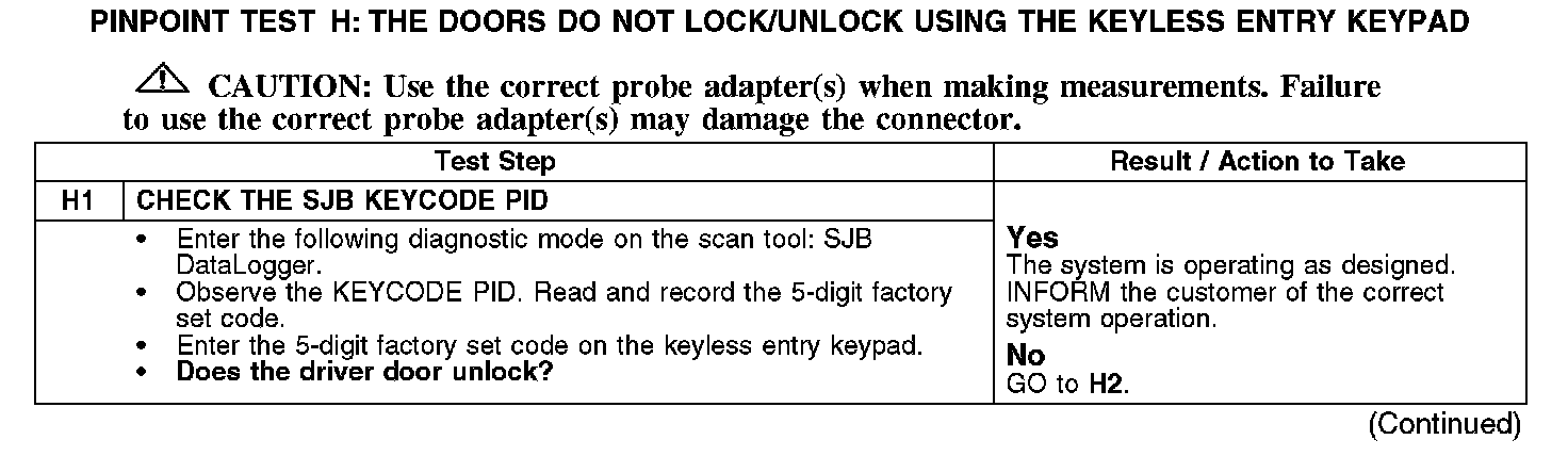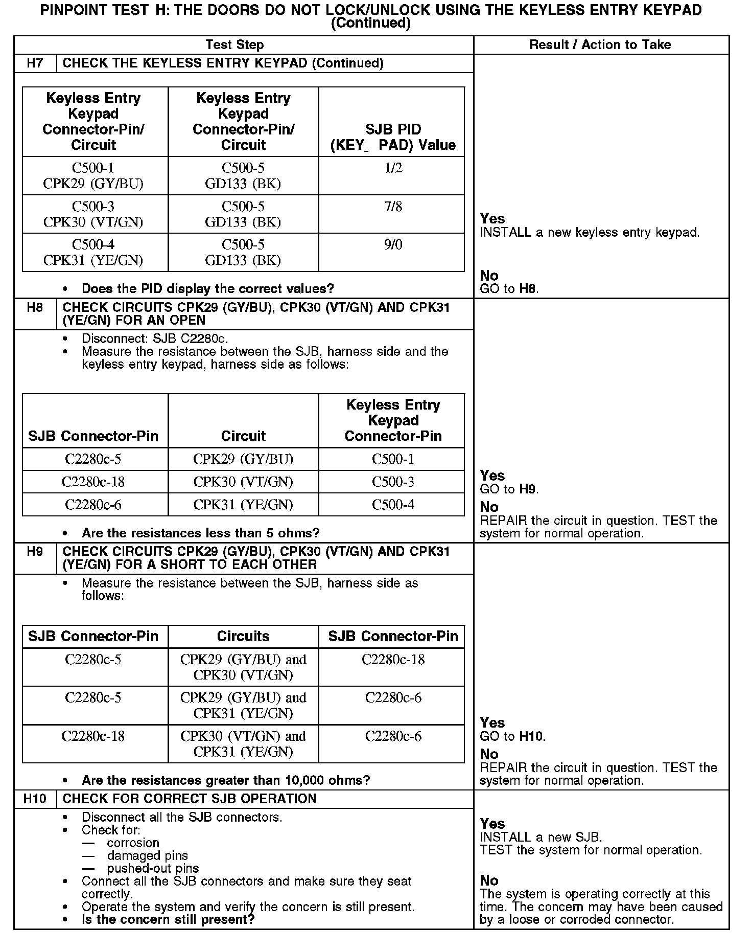 Home >> Ford >> 2008 >> Taurus AWD V6-3.5L >> Repair and Diagnosis >> Body and Frame >> Locks >> Power Locks >> Testing and Inspection >> Pinpoint Tests >> Test H: The Doors Do Not Lock/Unlock Using The Keyless Entry Keypad