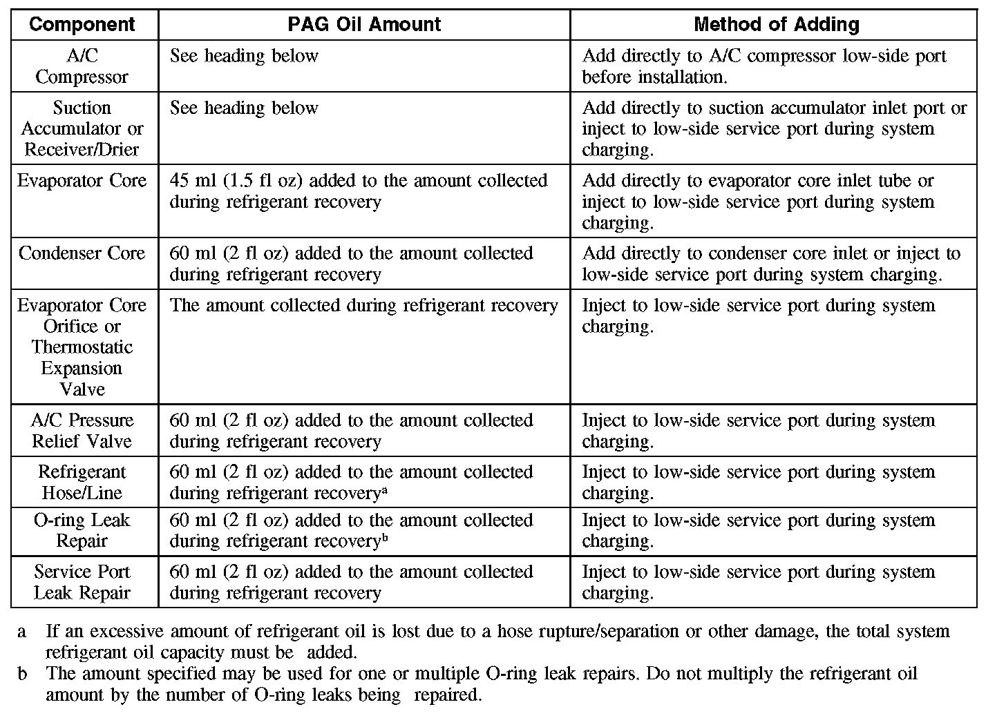 NOTE: During normal A/C operation, oil is circulated through the system with the refrigerant, and a small amount is retained in each component. If certain components of the system are removed, some of the refrigerant oil will go with the component. To maintain the original total oil charge, it is necessary to compensate for the oil lost by adding oil to the system with the new part.