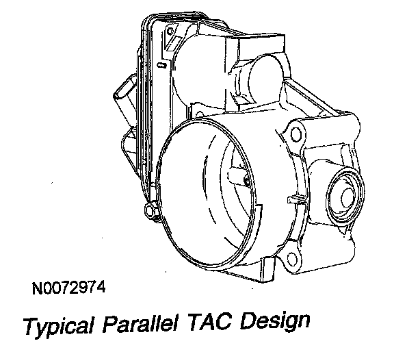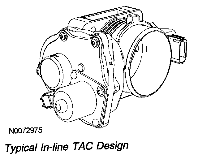 The electronic TAC is a DC motor controlled by the PCM (requires 2 wires). There are 2 designs for the TAC, parallel and in-line. The parallel design has the motor under the bore parallel to the plate shaft. The motor housing is integrated into the main housing. The in-line design has a separate motor housing. An internal spring is used in both designs to return the throttle plate to a default position. The default position is typically a throttle angle of 7 to 8 degrees from the hard stop angle. The closed throttle plate hard stop is used to prevent the throttle from binding in the bore (approximately 0.75 degree). This hard stop setting is not adjustable and is set to result in less airflow than the minimum engine airflow required at idle.