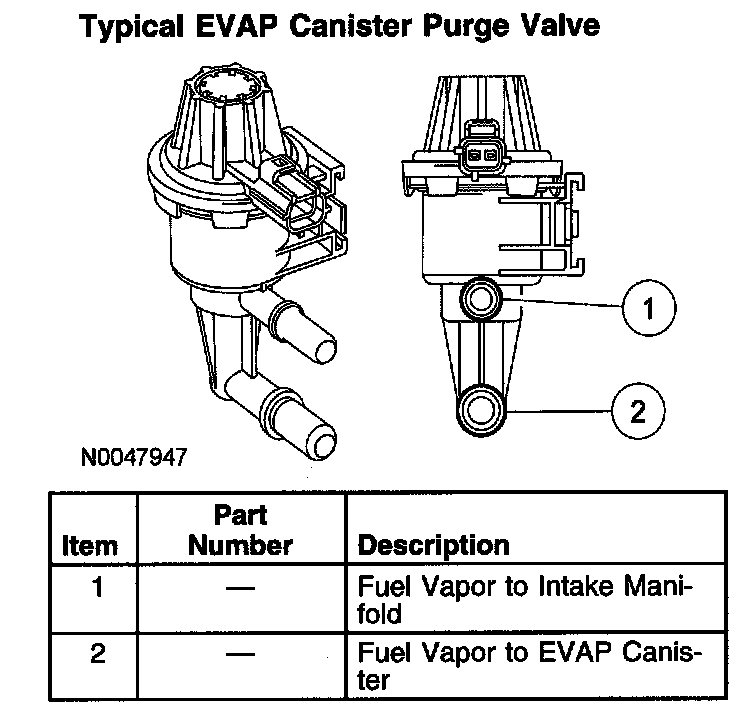 The EVAP canister purge valve is part of the enhanced EVAP system that is controlled by the PCM. This valve controls the flow of vapors (purging) from the EVAP canister to the intake manifold during various engine operating modes. The EVAP canister purge valve is a normally closed valve. The EVAP canister purge valve controls the flow of vapors by way of a solenoid, eliminating the need for an electronic vacuum regulator and vacuum diaphragm. The PCM outputs a signal between 0 mA and 1,000 mA to control the EVAP canister purge valve.