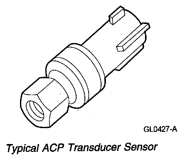 The ACP transducer sensor is located in the high pressure (discharge) side of the A/C system. The ACP transducer sensor provides a voltage signal to the PCM that is proportional to the A/C pressure. The PCM uses this information for A/C clutch control, fan control and idle speed control.
