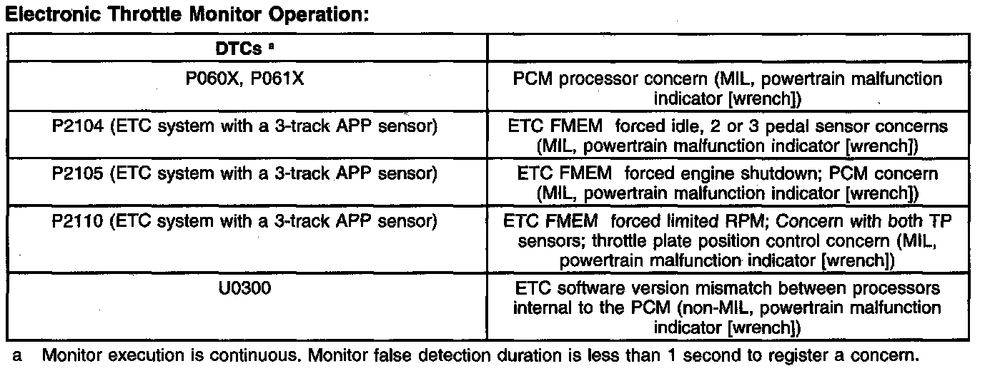 The ETC monitor system is distributed across 2 processors within the PCM: the main powertrain control processor unit (CPU) and a separate monitoring processor. The primary monitoring function is carried out by the independent plausibility check (IPC) software, which resides on the main processor. It is responsible for determining the driver-demanded torque and comparing it to an estimate of the actual torque delivered. If the generated torque exceeds driver demand by a specified amount, appropriate corrective action is taken.
