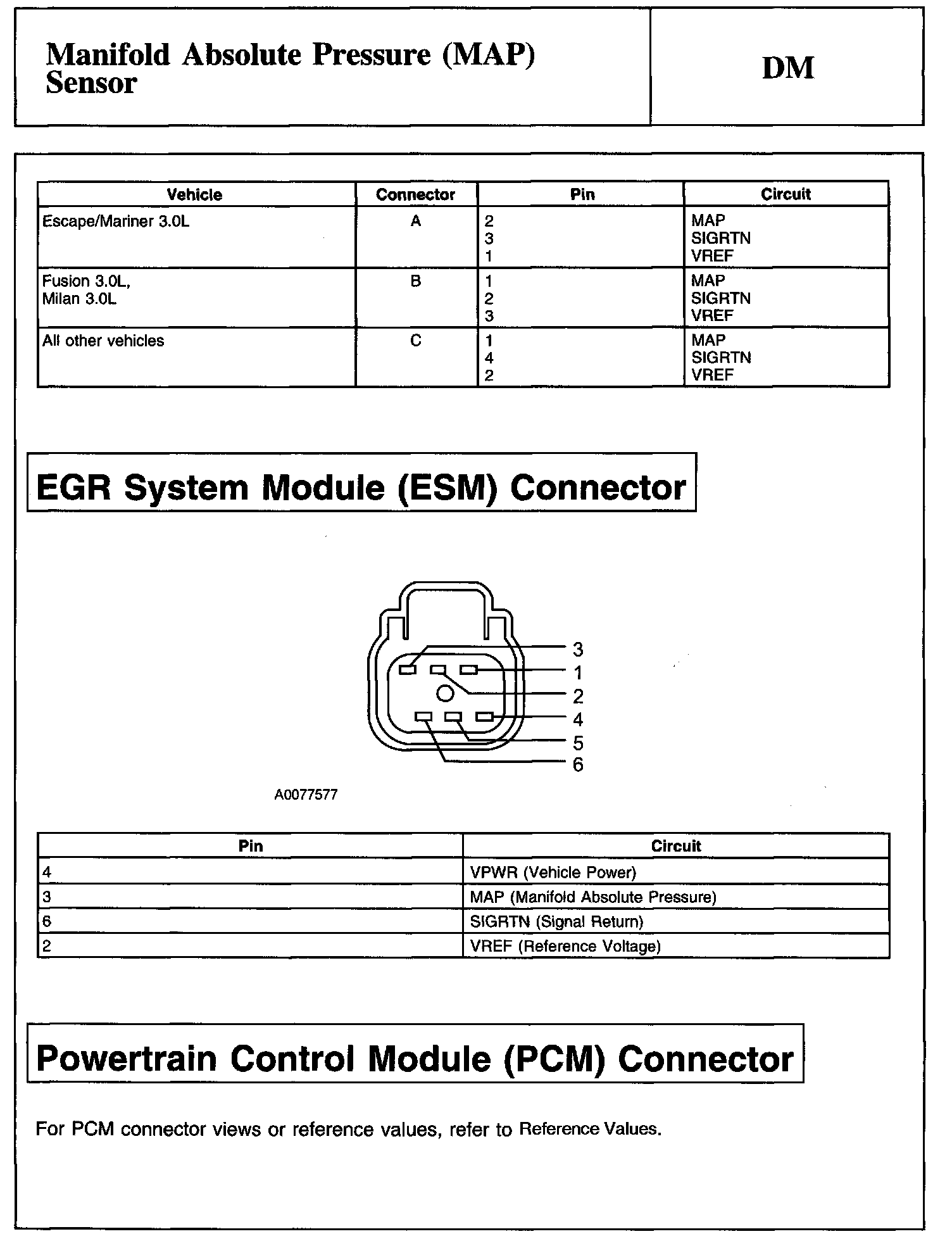 Manifold Absolute Pressure (MAP) Sensor Connector, EGR System Module (ESM) Connector And Powertrain Control Module (PCM) Connector:
