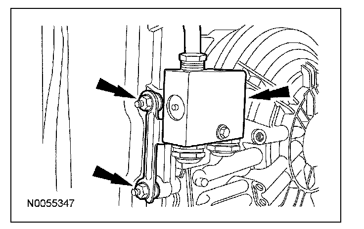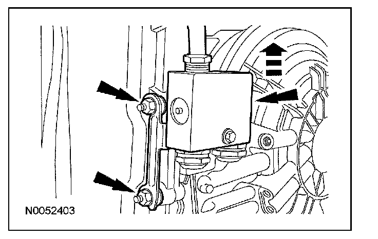 17. Remove the 2 nuts, pull the transmission fluid cooler thermal bypass valve straight up and position it aside.
