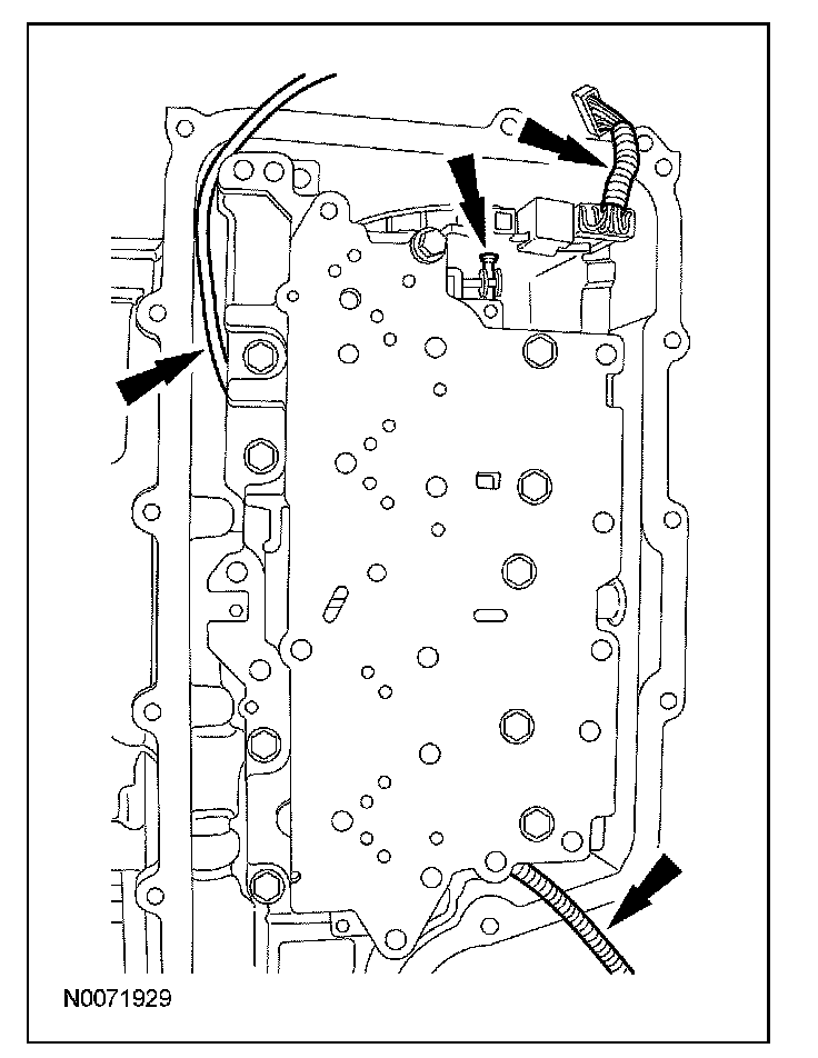 7. CAUTION: Make sure not to pinch the turbine shaft speed (TSS), output shaft speed (OSS) or transmission range (TR) sensor wiring harnesses when installing the solenoid body. Damage to the wiring harness will occur.